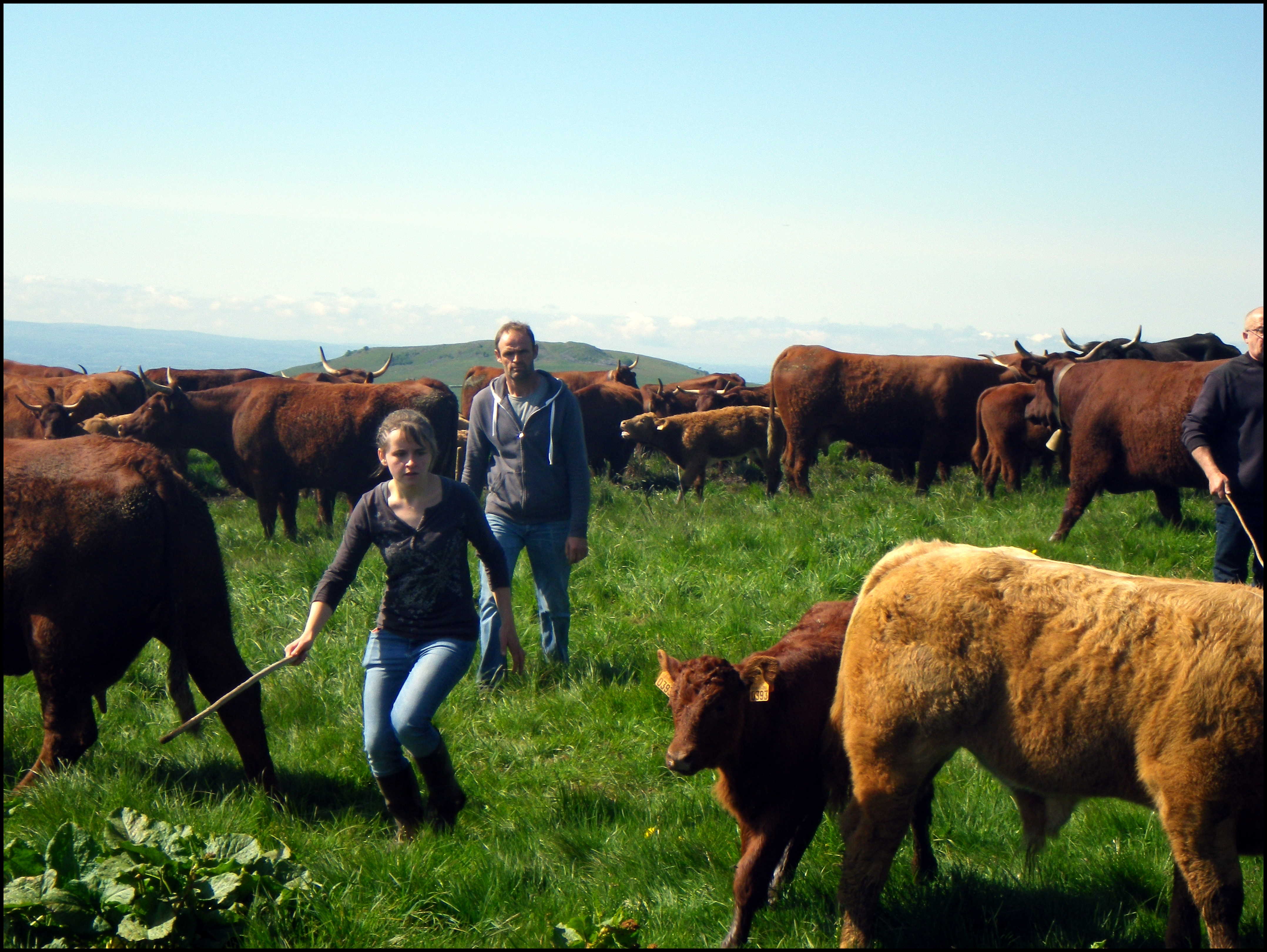En fin de matinée, tout ce beau monde finit par arriver à la vacherie de Niermont, nichée bien à l'abri des vents du nord à l'ombre du Puy du même nom. On ouvre les portes de la remorque dans laquelle sont montés les veaux les plus jeunes : c'est assez merveilleux de voir les petits courir jusqu'au troupeau, et d'essayer de repérer leur mère dans la cohue générale.