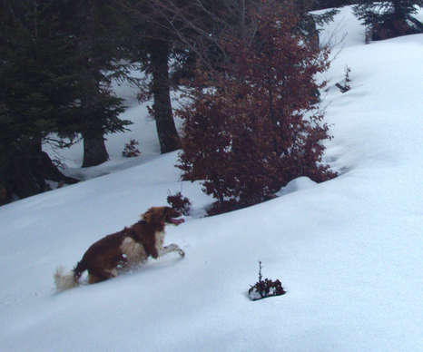Généralement, à la mi-juin, la déprime me gagne : j’attends déjà l’hiver prochain. Et l’attente est longue. Cette année, il a fallu se résoudre à poireauter jusqu’à la mi-janvier – et encore, deux jours plus tard, tout avait fondu. Raison pour laquelle, bien qu’on soit à la toute fin de mars, et même très bientôt début avril, je ne perds pas une minute pour grimper sur les hauteurs, là où se découvrent encore de beaux champs de neige. Avec mon chien. Une paire de skis sur l’épaule (avant d’y glisser les pattes).